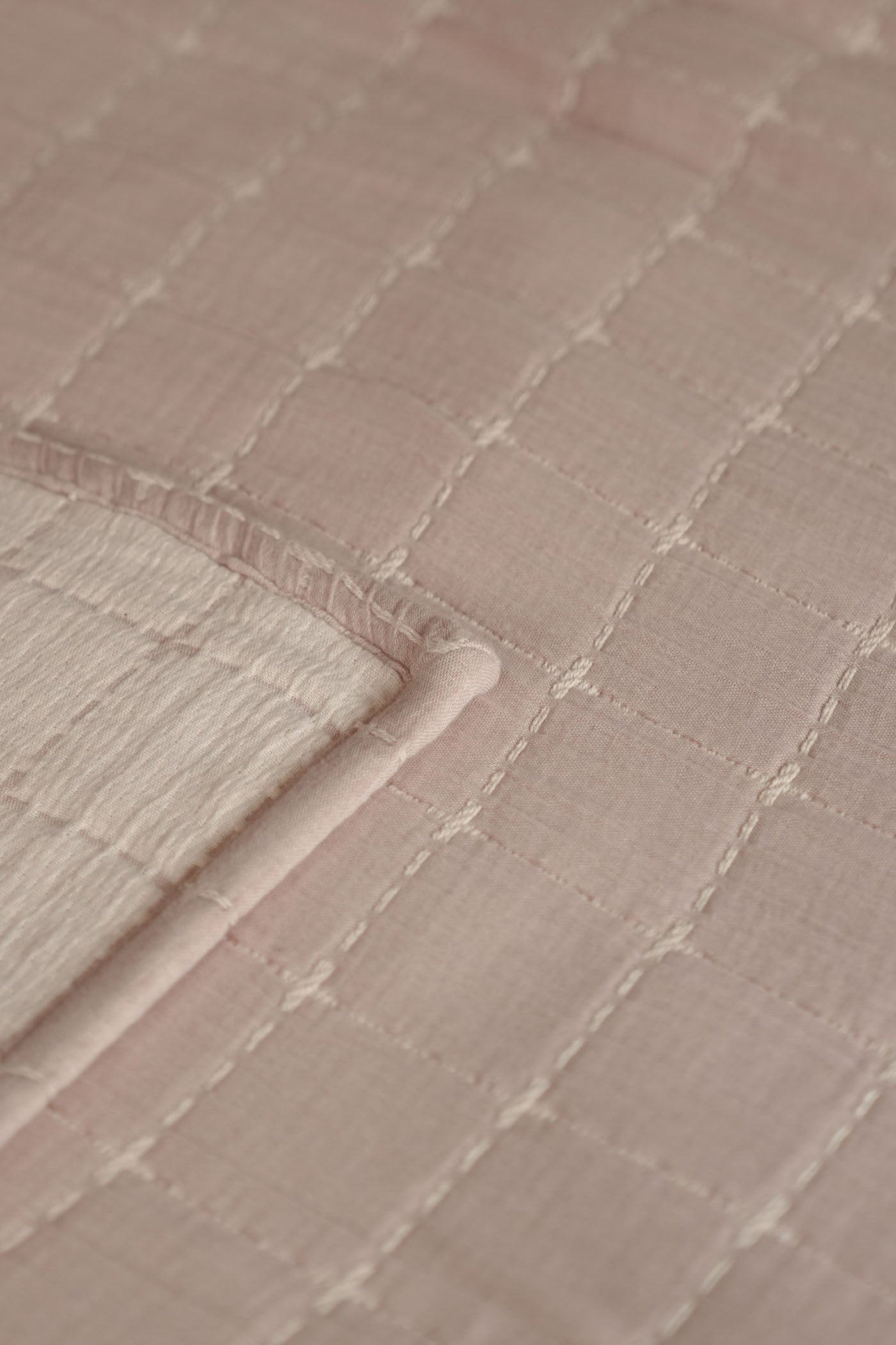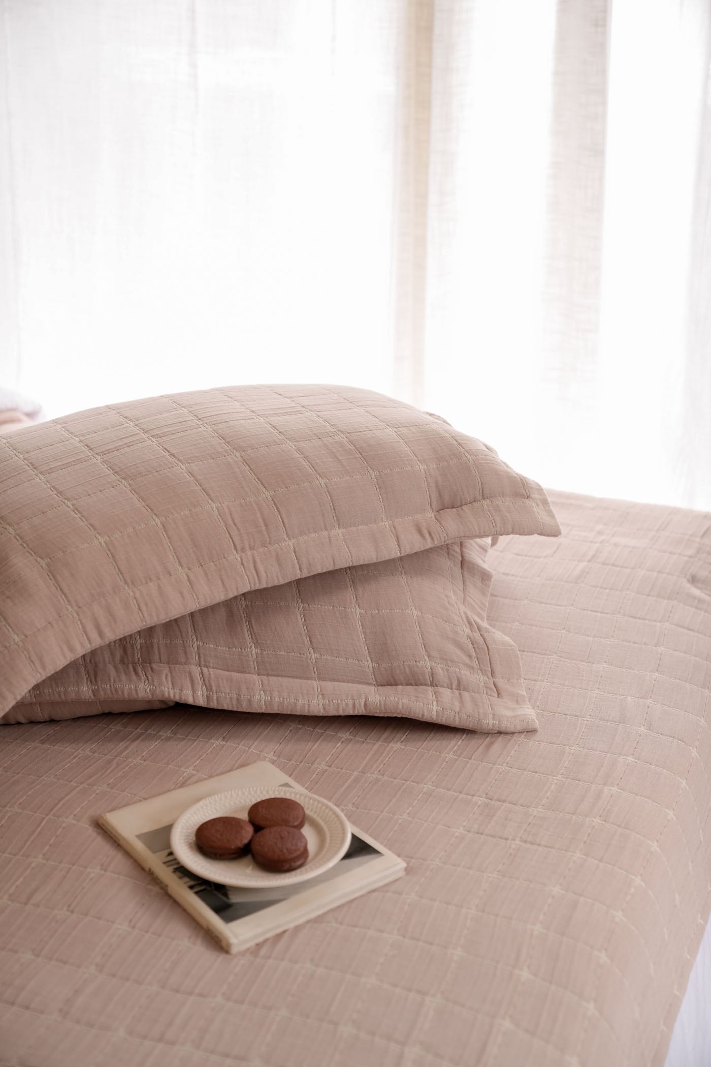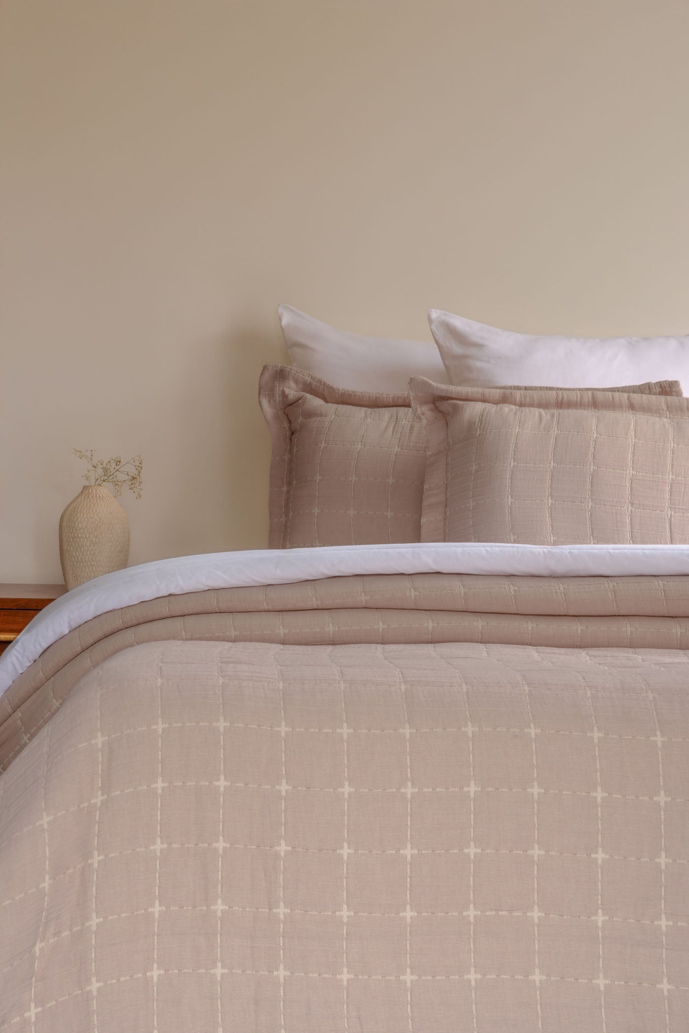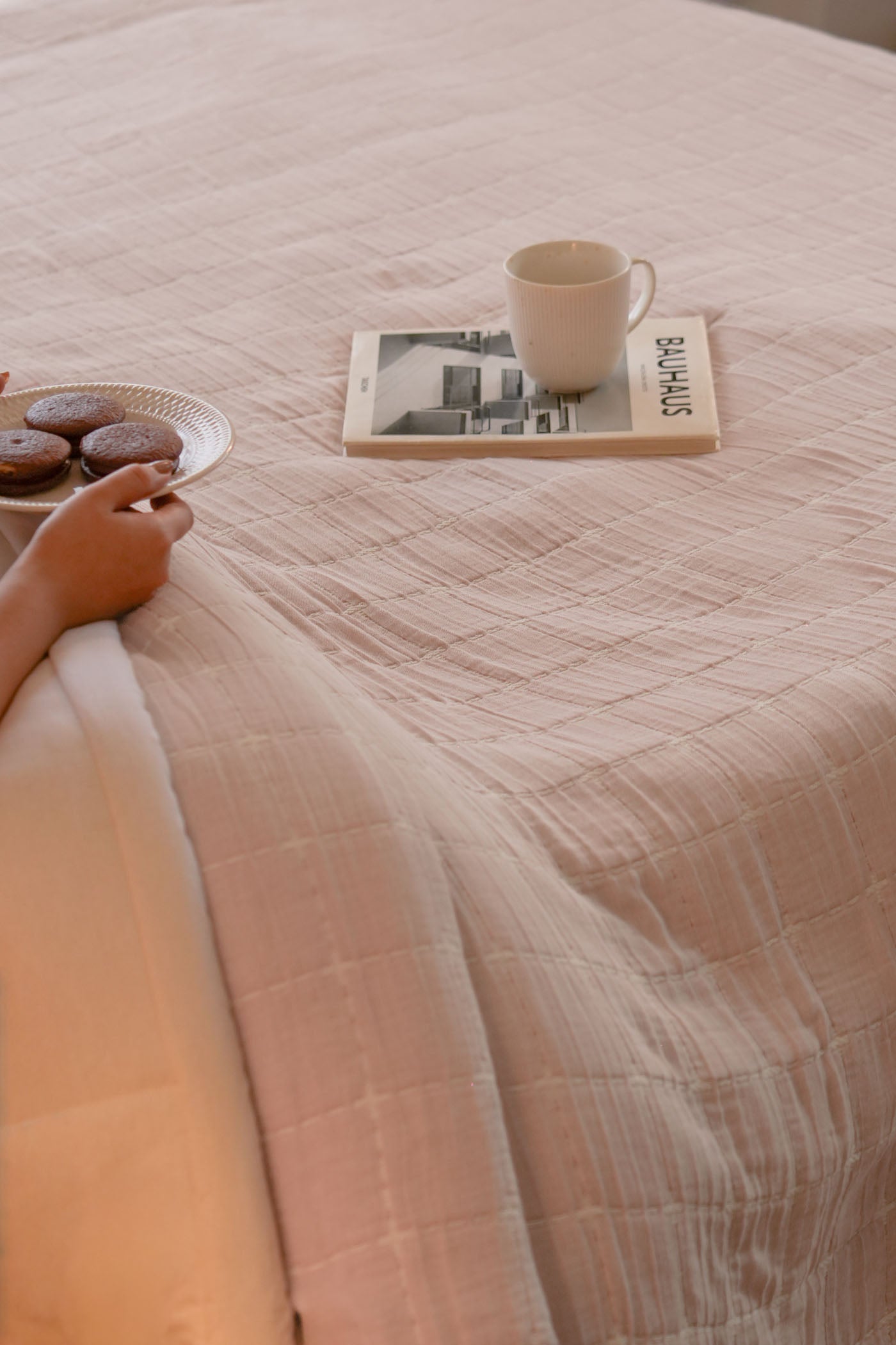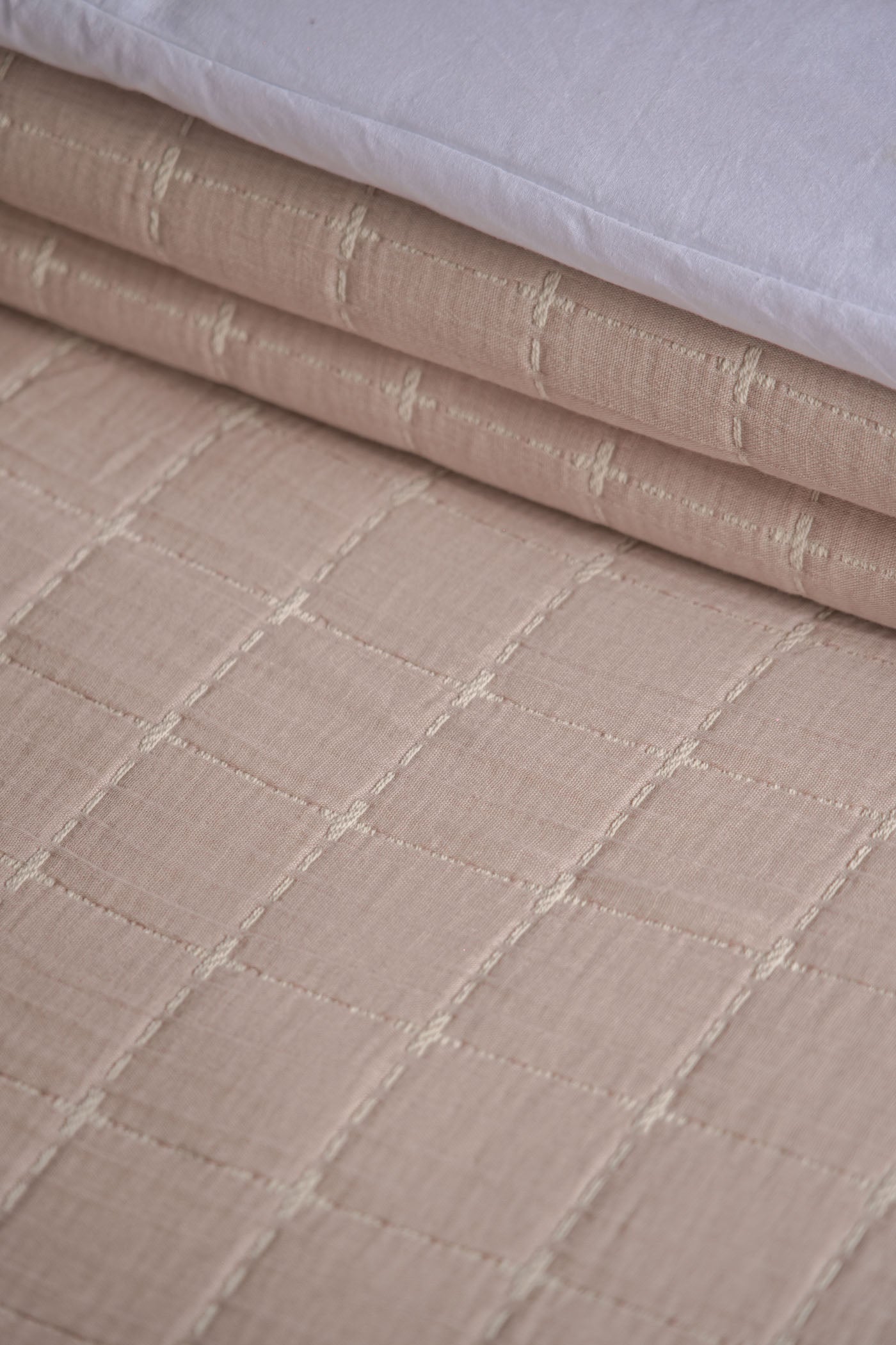 Introducing Checkaura, a bedspread that effortlessly blends simplicity with sophistication. This reversible masterpiece transforms your bedroom with its delicate design, providing a sensual feel and a grounded look, while the cooling touch ensures warmth in any weather. Elevate your sleep sanctuary with Checkaura, where style meets comfort in every stitch.