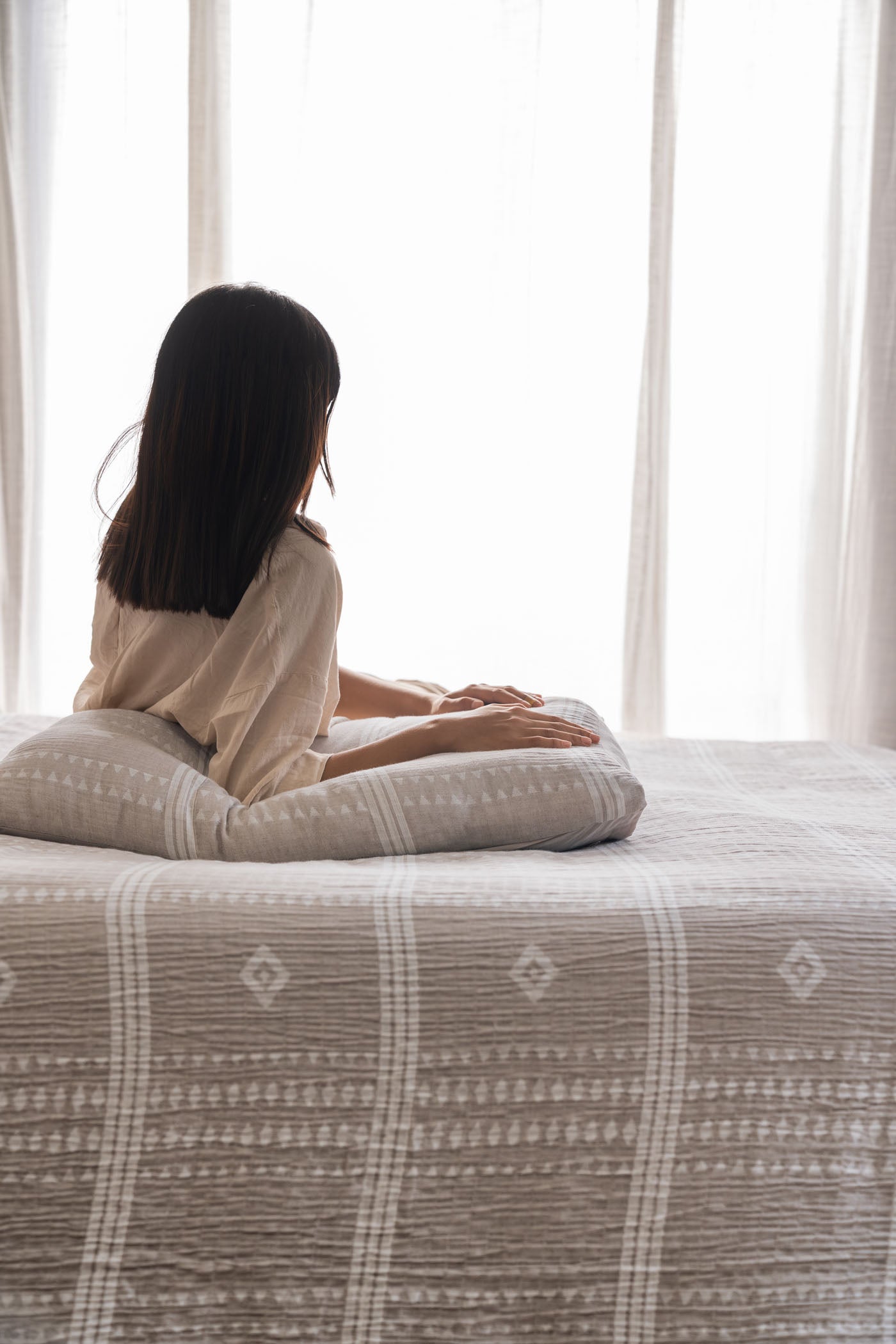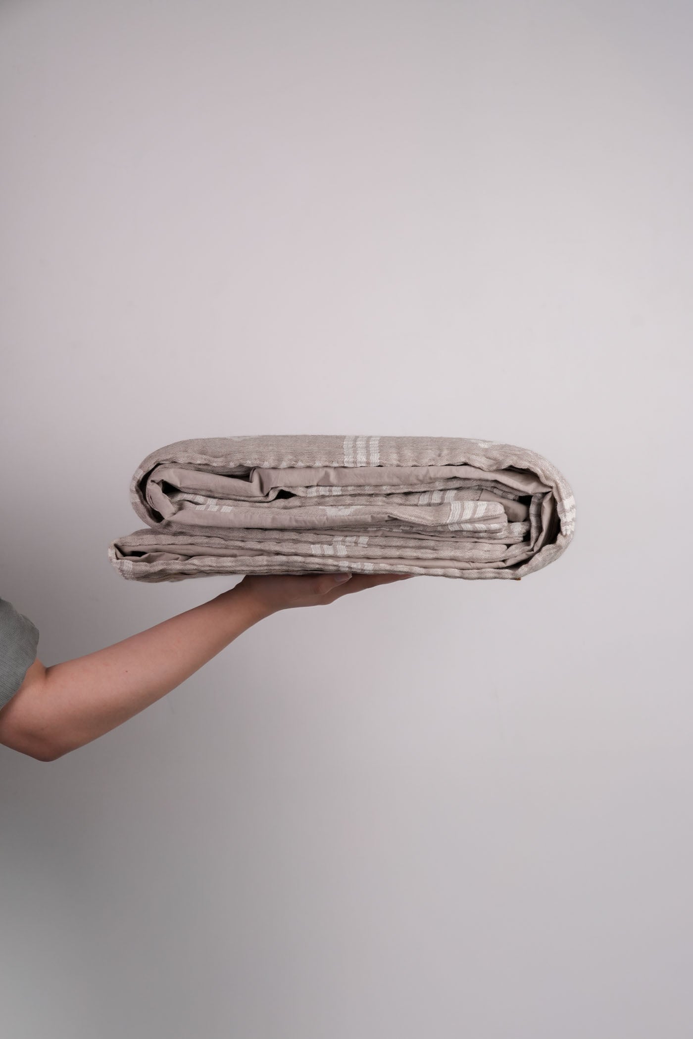 Rooted in simplicity, our Crista Duvet cover set captures the quiet beauty of handwoven geometry. Designed in a soothing palette, the woven pattern draws from traditional tribal motifs — soft linear textures. Crafted from 100% cotton, the fabric has a naturally crinkled, tactile feel that drapes beautifully and works effortlessly across seasons. The bed cover is thoughtfully finished with concealed buttons, allowing you to close it neatly around your quilt for a cleaner, more structured look.