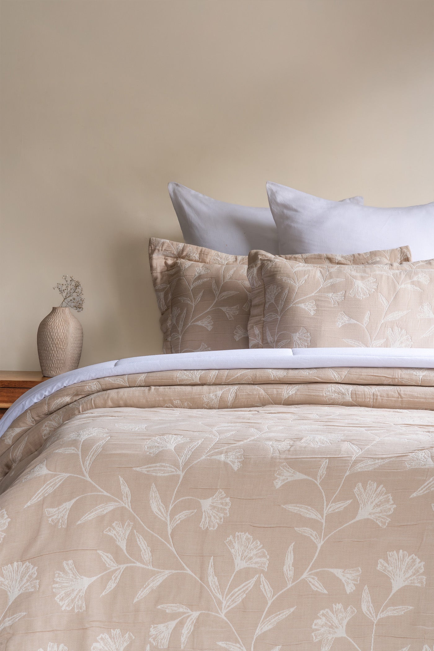 Softly understated yet inherently luxurious, our Amira bed Cover Set brings texture and calm to your space. Crafted from 100% cotton, the fabric features delicate -work inspired by wild meadow florals — gently raised design that lends a subtle dimension and natural charm.