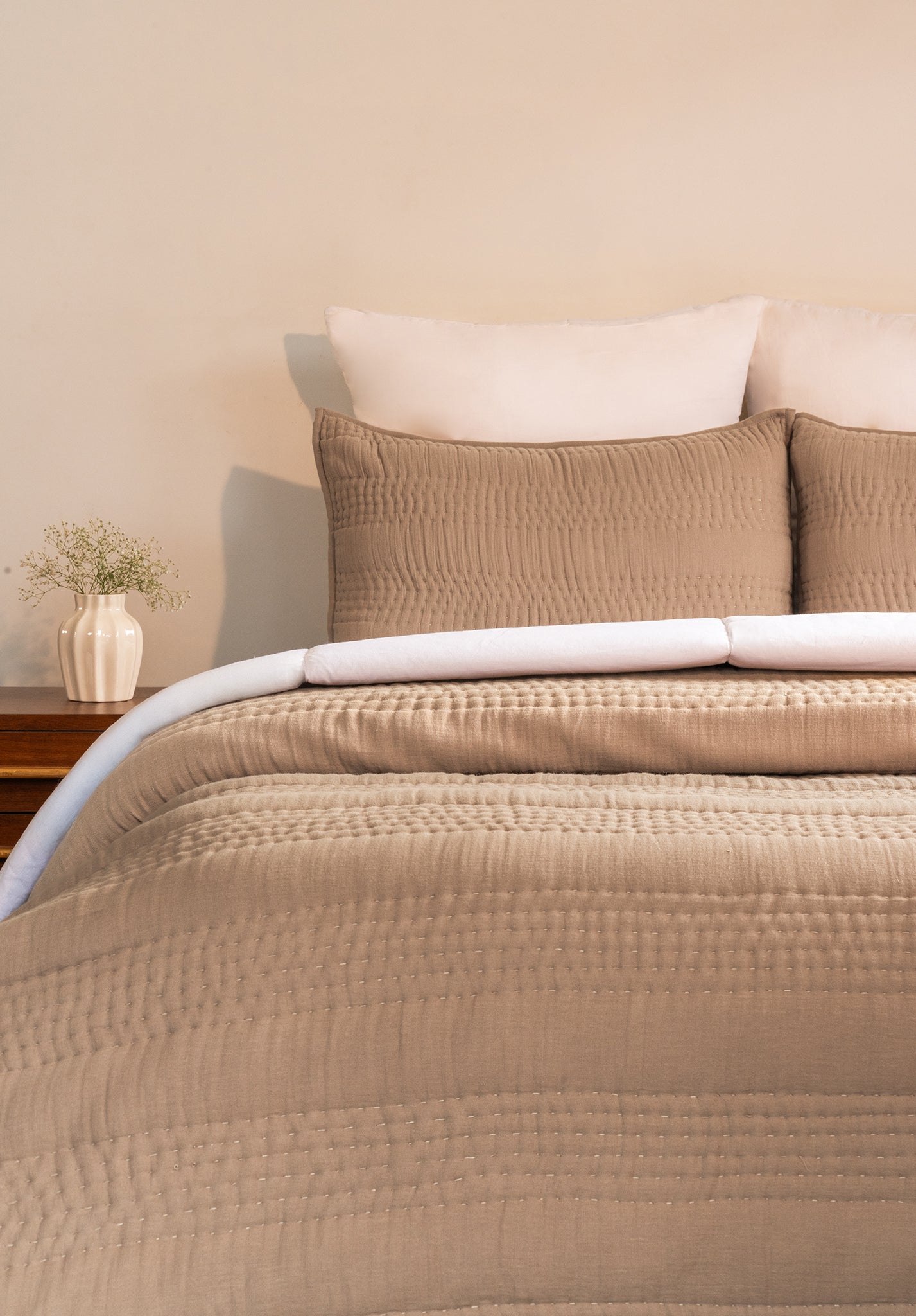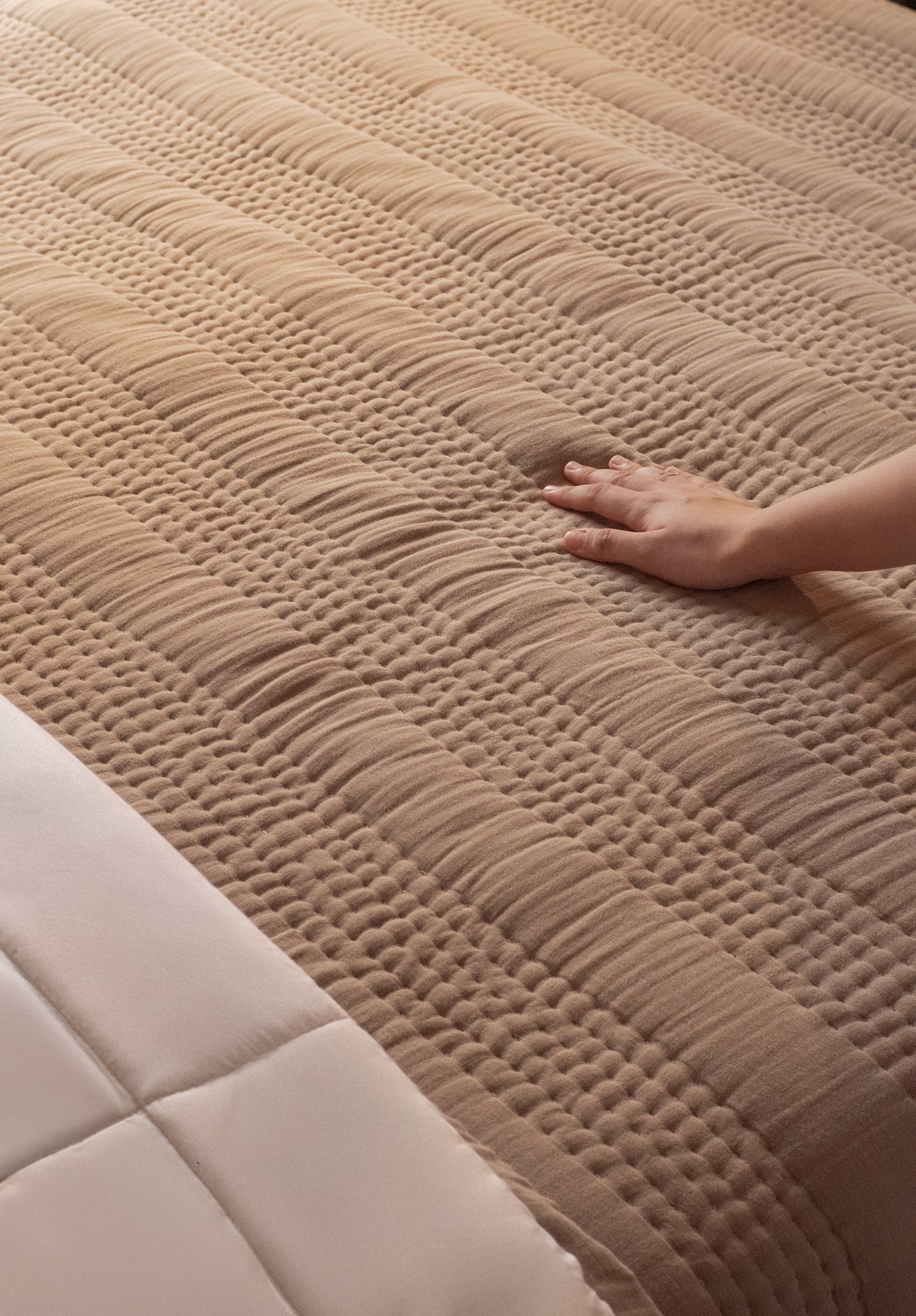 Our hand-stitched quilts are crafted with traditional techniques, delivering an exceptionally soft and lofty texture that feels as light and cozy as a cloud. The intricate hand stitching ensures even distribution of the batting, making the quilt fluffy, breathable, and luxuriously soft. The reversible side features a beautiful striped pattern on the reverse side, perfectly complementing the front for a versatile and stylish look.